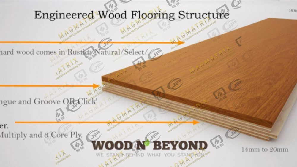 หลายชั้นผูกมัดเข้าด้วยกันในรูปแบบข้ามเม็ดทำไม้วิศวกรรมซึ่งช่วยเพิ่มความเสถียรของมิติ โครงสร้างมีชั้นบนแผ่นไม้อัดไม้จริง (หนา 2-5 มม.) เชื่อมต่อกับชั้นไม้อัดหลายชั้น การก่อสร้างที่ไม่เหมือนใครนี้สร้างผลิตภัณฑ์ที่แข็งแกร่งและแข็งกว่าไม้เนื้อแข็ง ผลิตภัณฑ์ส่วนใหญ่มาพร้อมกับขอบลิ้นและร่อง ผู้ผลิตหลายรายใช้ระบบคลิกล็อคเพื่อให้การติดตั้งง่ายขึ้น